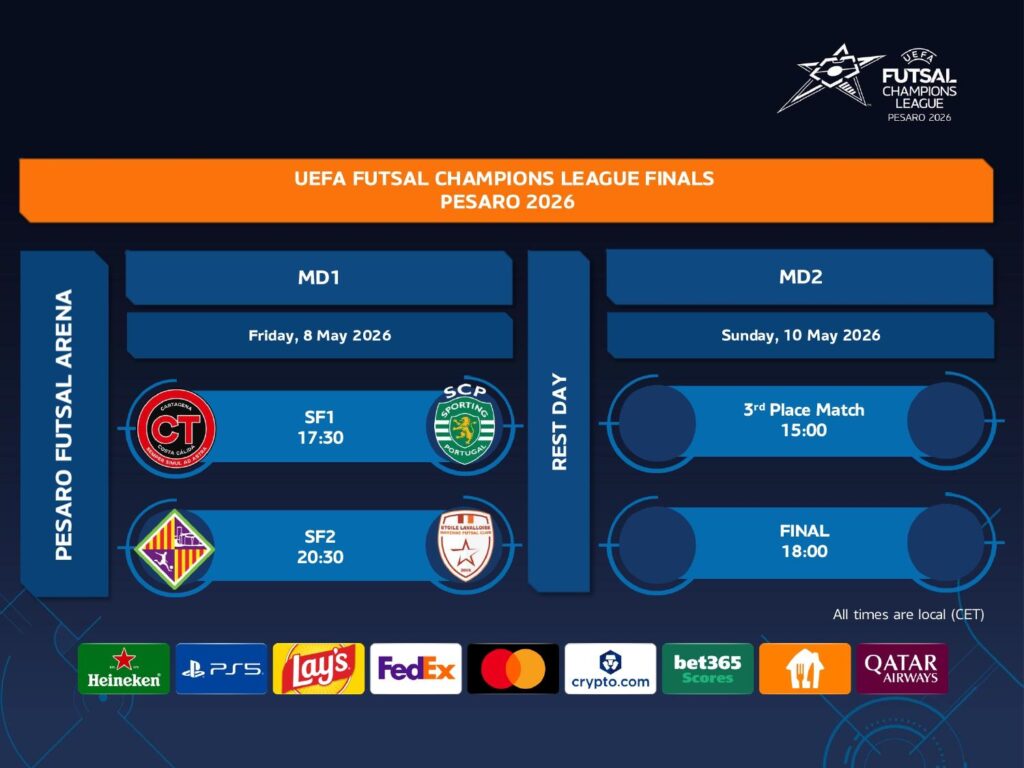 LE FAB 4 – Nella città cara a Rossini approdano due spagnole, una portoghese e una francese. I tri-campioni d’Europa (in carica) dell’Illes Balears Palma, il Cartagena Costa Cálida dell’azzurro Motta e lo Sporting di capitan Merlim, che a EURO 2026 ha eguagliato il record di presenze in Nazionale (137) di Marco Ercolessi; dulcis in fundo, i francesi dell’Etoile Lavalloise. Le ‘Fab 4’ si sono qualificate attraverso la nuova formula della UEFA Futsal Champions League, che ha visto l’introduzione di ottavi e quarti (andata e ritorno) in sostituzione del tradizionale Élite Round. Il Palma punta a un leggendario poker, il Cartagena Costa Cálida approda per la seconda volta consecutiva in Final Four dopo il bronzo di Le Mans della passata edizione; lo Sporting ha raggiunto la sua dodicesima semifinale, uno storico primato avvalorato dalla sesta partecipazione consecutiva in Final Four; l’Etoile Lavalloise, infine, è la seconda compagine francese a raggiungere le semifinali dopo l’ACCS Asnières Villeneuve 92 nella stagione 2021-22.